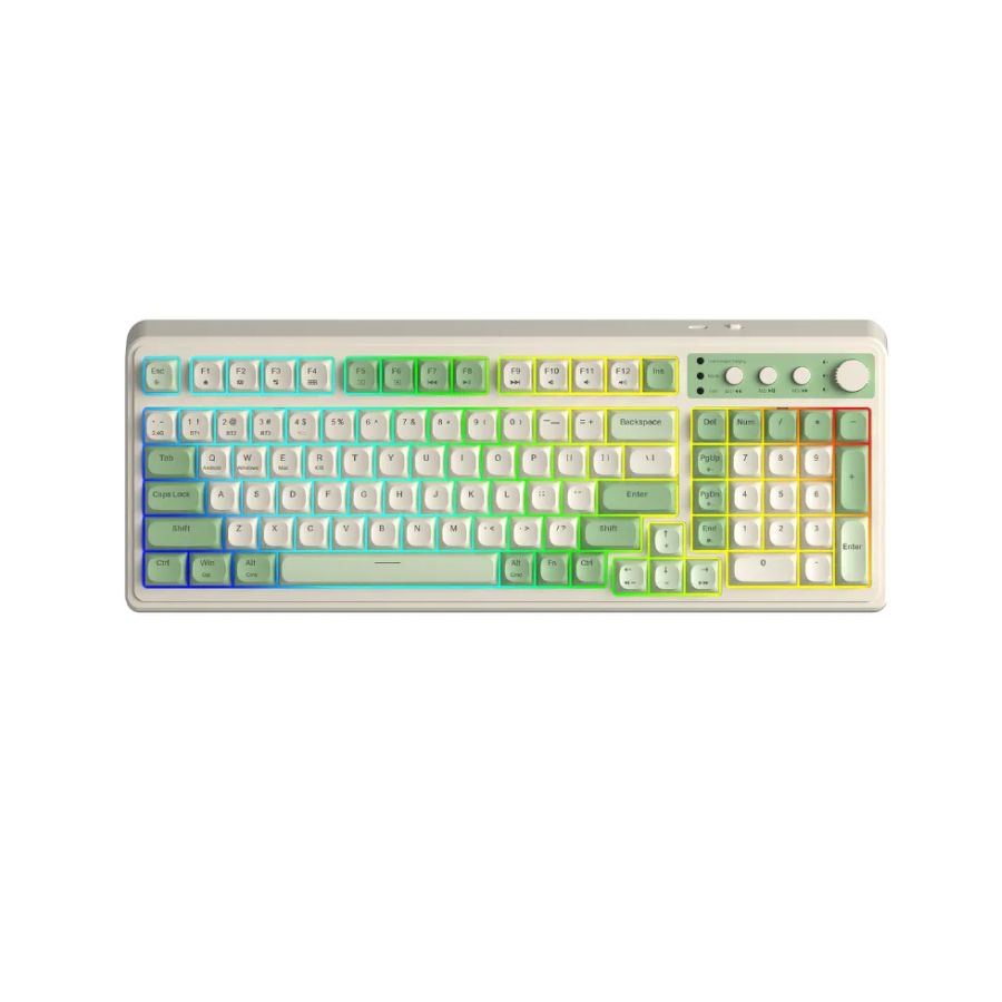 AULA S99 sở hữu thiết kế layout 99 phím, giúp tiết kiệm không gian bàn làm việc nhưng vẫn đảm bảo đầy đủ các phím chức năng cần thiết. Bộ keycap phối màu xanh lá + be tạo cảm giác tươi mới, phù hợp với nhiều phong cách setup khác nhau.