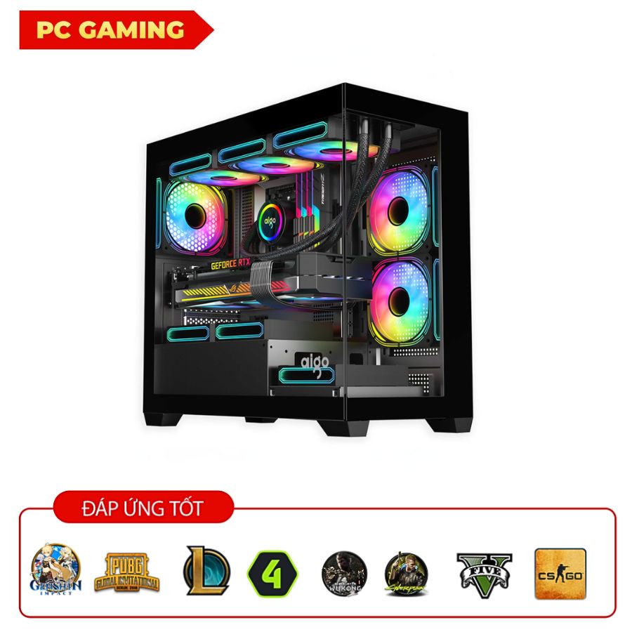 - Vỏ case: AIGO C218M Black + 4 Fan RGB Centaur CTPRO-9900 Black + hub điều khiển