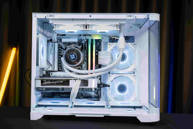 - Hệ thống tản nhiệt nước AIO với quạt ARGB màu trắng không chỉ làm mát hiệu quả mà còn tạo điểm nhấn thẩm mỹ cho dàn máy.