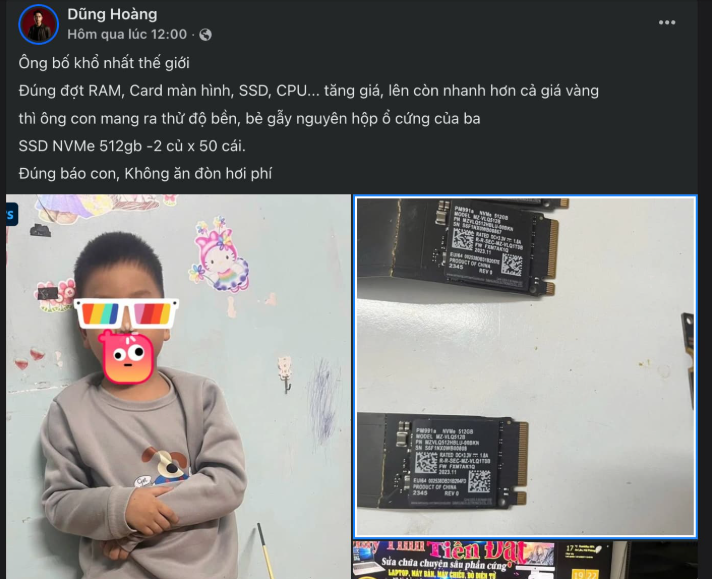 Vụ việc được chia sẻ lần đầu trong một nhóm Facebook chuyên về lắp ráp PC và phần cứng máy tính. Người bố đã đăng tải hình ảnh hàng loạt ổ SSD bị cong vênh nghiêm trọng, nhiều chiếc biến dạng rõ rệt, gần như không thể sử dụng.