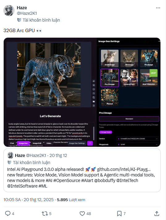 Theo ghi nhận, thông tin về GPU Arc 32GB không xuất hiện trực tiếp trong thông báo sản phẩm, mà được phát hiện thông qua ảnh chụp màn hình trong tài liệu hướng dẫn sử dụng AI Playground. Một trong những hình ảnh cho thấy một card đồ họa chưa xác định đang xử lý tác vụ AI với 32GB bộ nhớ đồ họa khả dụng.